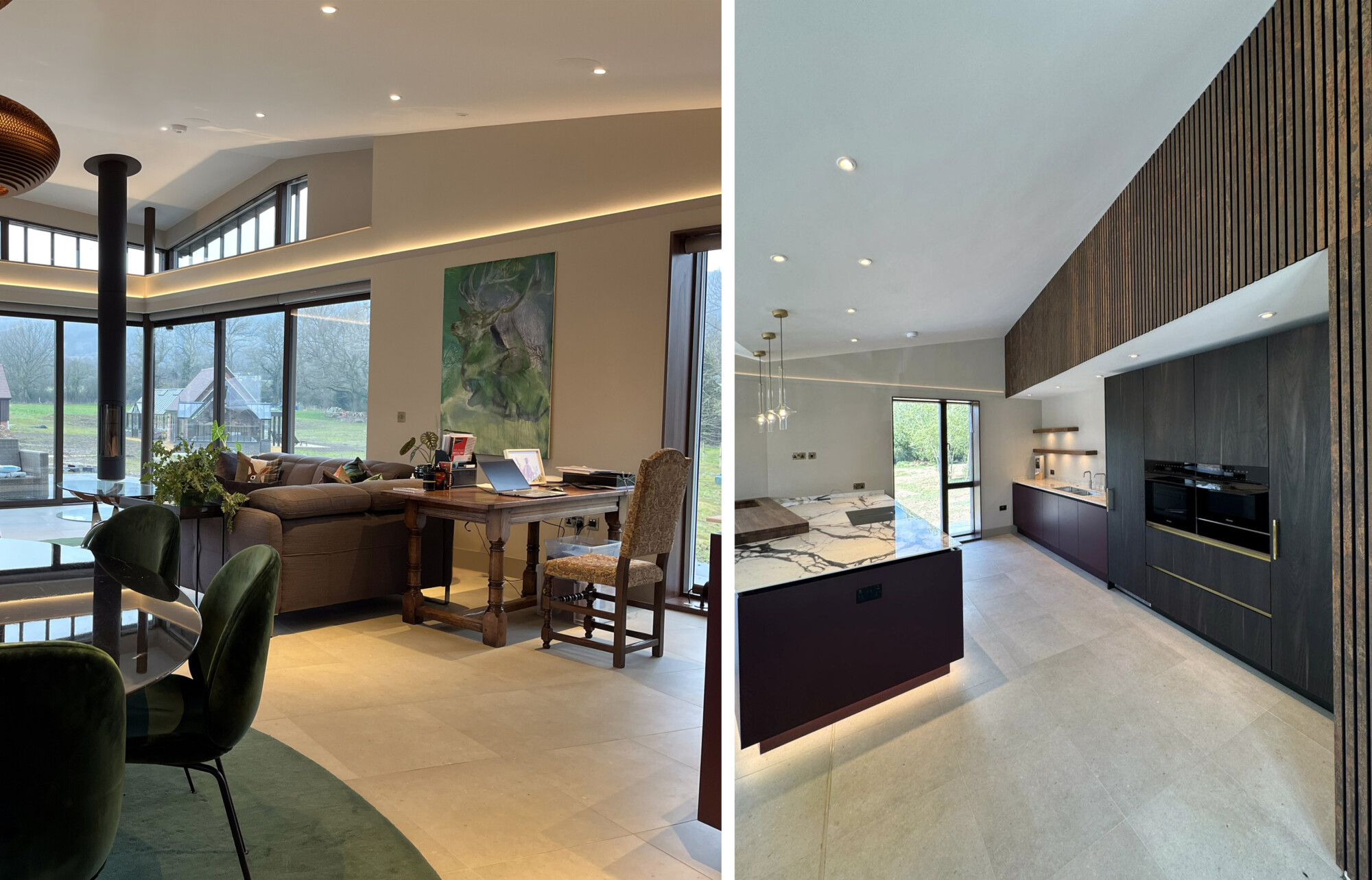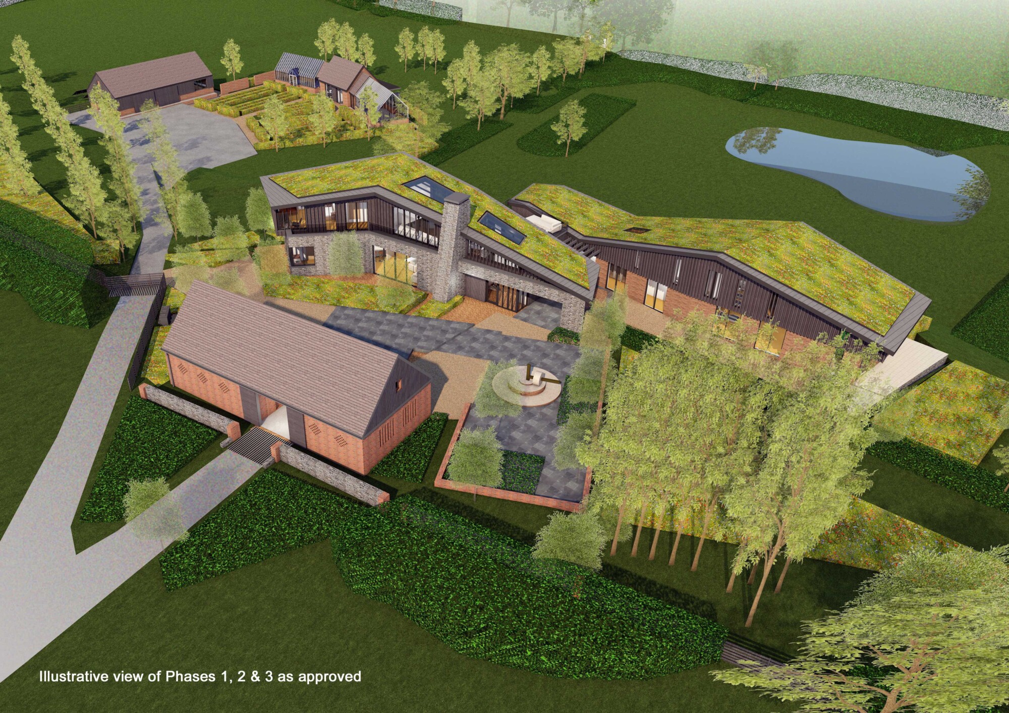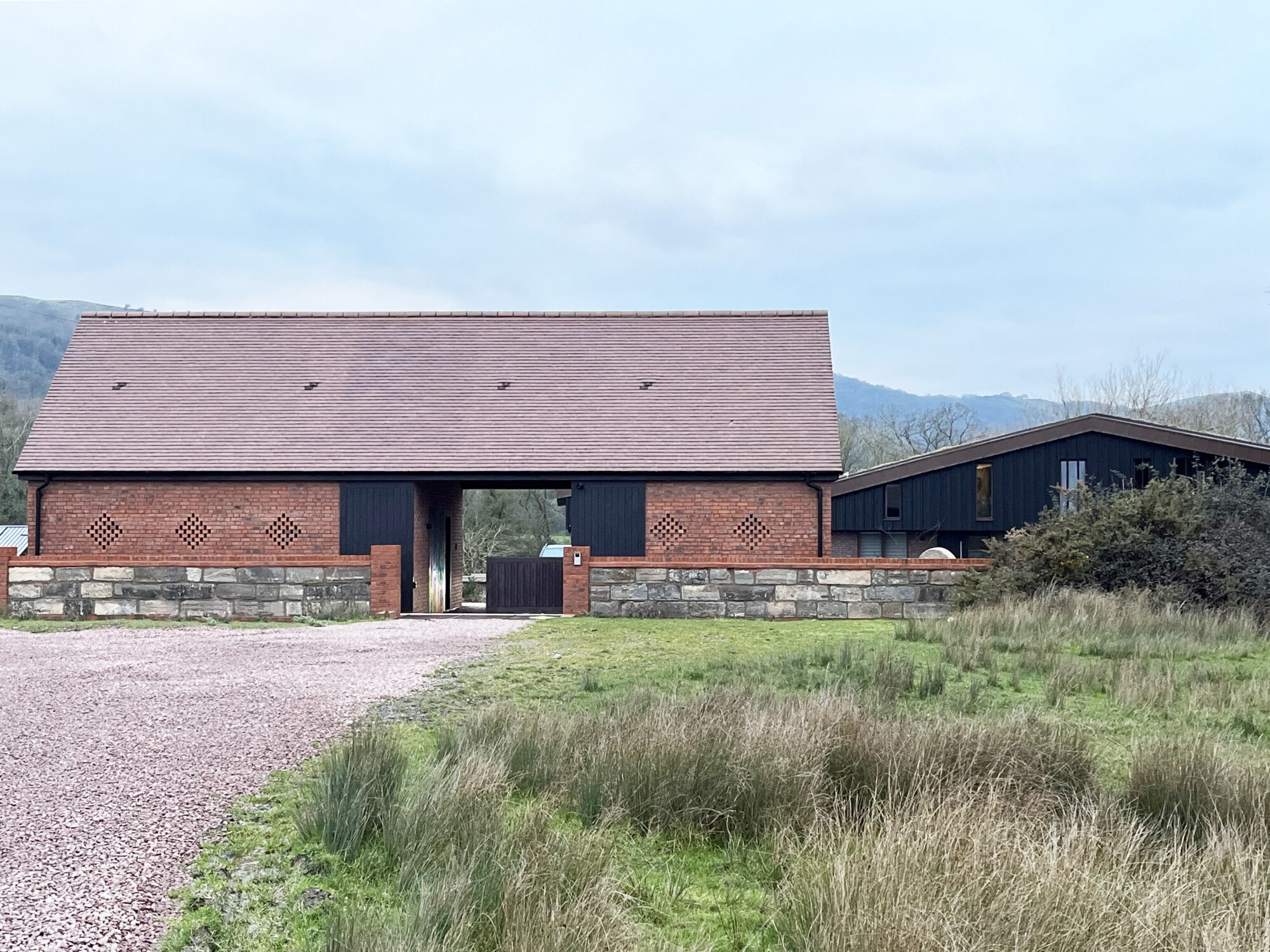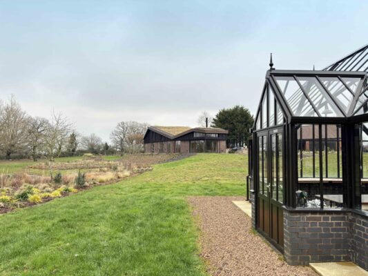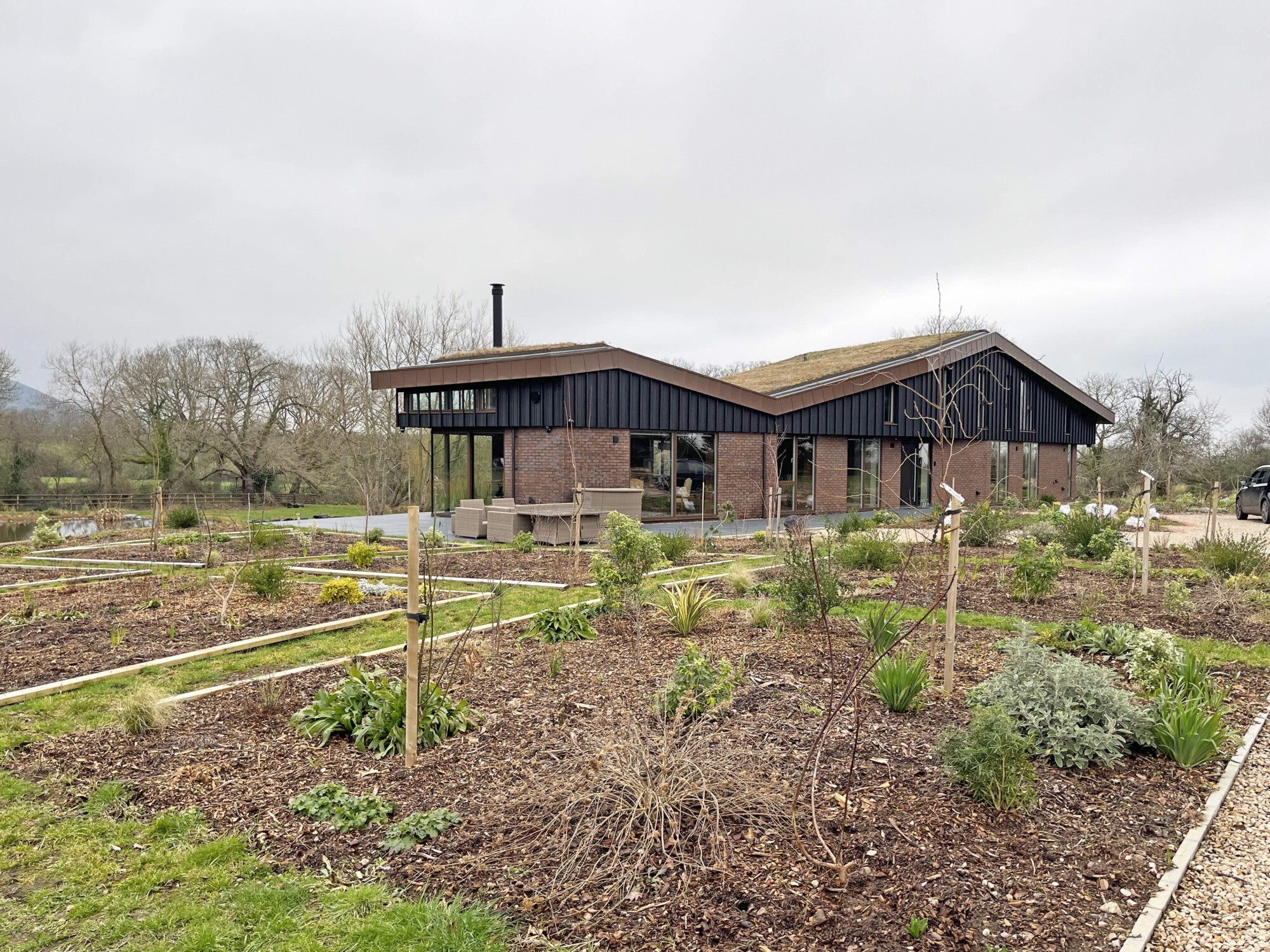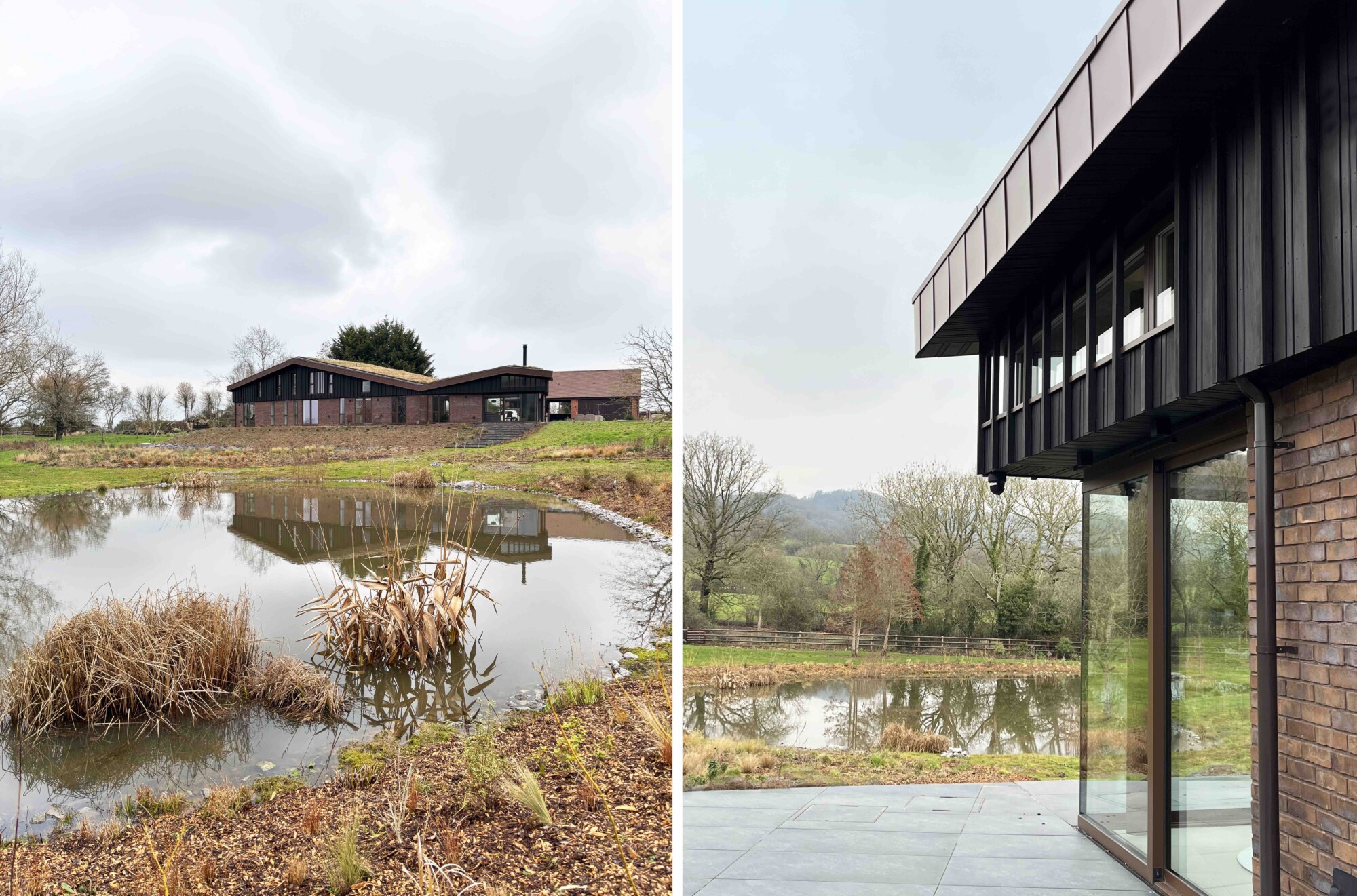 Transformational redevelopment of a much-altered Victorian farmstead and its large commercial chicken sheds to create a sustainable new home rooted in the landscape within this 2.5ha site. A new redbrick ‘barn’ fronts the Common, creating a drive-through garage with large bat-loft above, and giving the impression of a historic building that subtly screens this contemporary new home from the road within the AONB. The design for this striking building is inspired by the profile of the Malvern Hills beyond, and the character of agricultural barns in the region. The client’s passion for landscape, cultivation and gardening is addressed with a new garden-building and home office, flanked on each side by substantial greenhouses. The introduction of a large balancing pond creates a beautiful focal point, whilst supporting ecology and managing pre-existing drainage and flood issues. A new tractor shed and workshop prevents any views of the extensive PV array being visible from the house or wider landscape. This super-insulated new home with PVs and GSHP achieves an EPC rating of A+. Full RIBA Services provided through all stages. Phases 1 and 2 only completed to date.